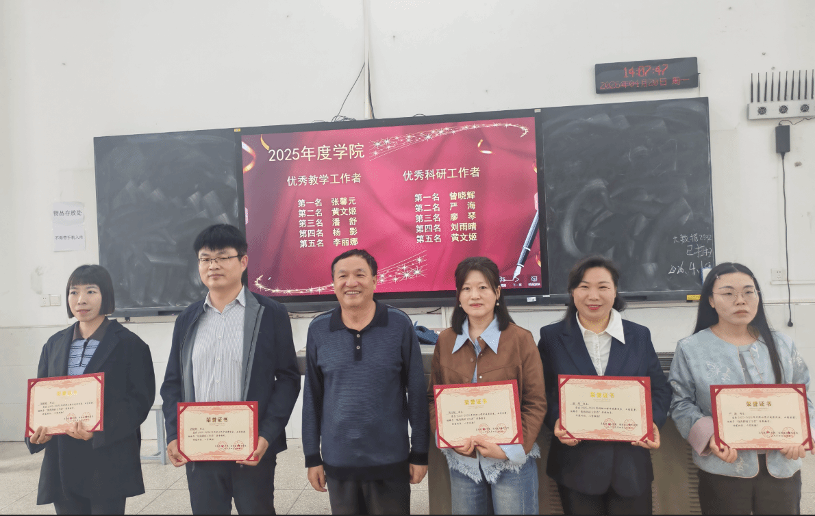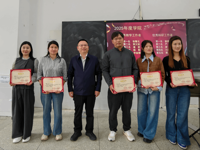 大会上,彭贤则校长助理宣读《关于表彰2025年度学院专项工作优秀工作者的决定》。根据2025年度教学成果积分、科研成果积分综合评审,学院授予张馨元、黄文姬、潘舒、杨影、李丽娜5位教师“优秀教学工作者”称号,授予曾晓辉、严海、廖琴、刘雨晴、黄文姬5位教师“优秀科研工作者”称号。