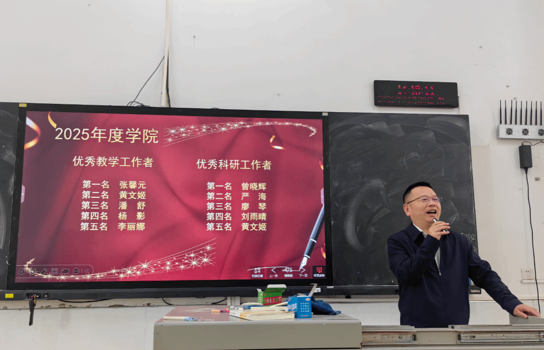 彭贤则校长助理作总结讲话,他充分肯定了全体教师在2025年度教学、科研工作中取得的优异成绩,希望受表彰教师珍惜荣誉、再接再厉,发挥示范引领作用;号召全院教职工学习先进、争当先进,在“十五五”开局之年凝心聚力、勇毅前行,推动学院教学质量与科研水平再上新台阶,为学院高质量发展奠定坚实基础。
